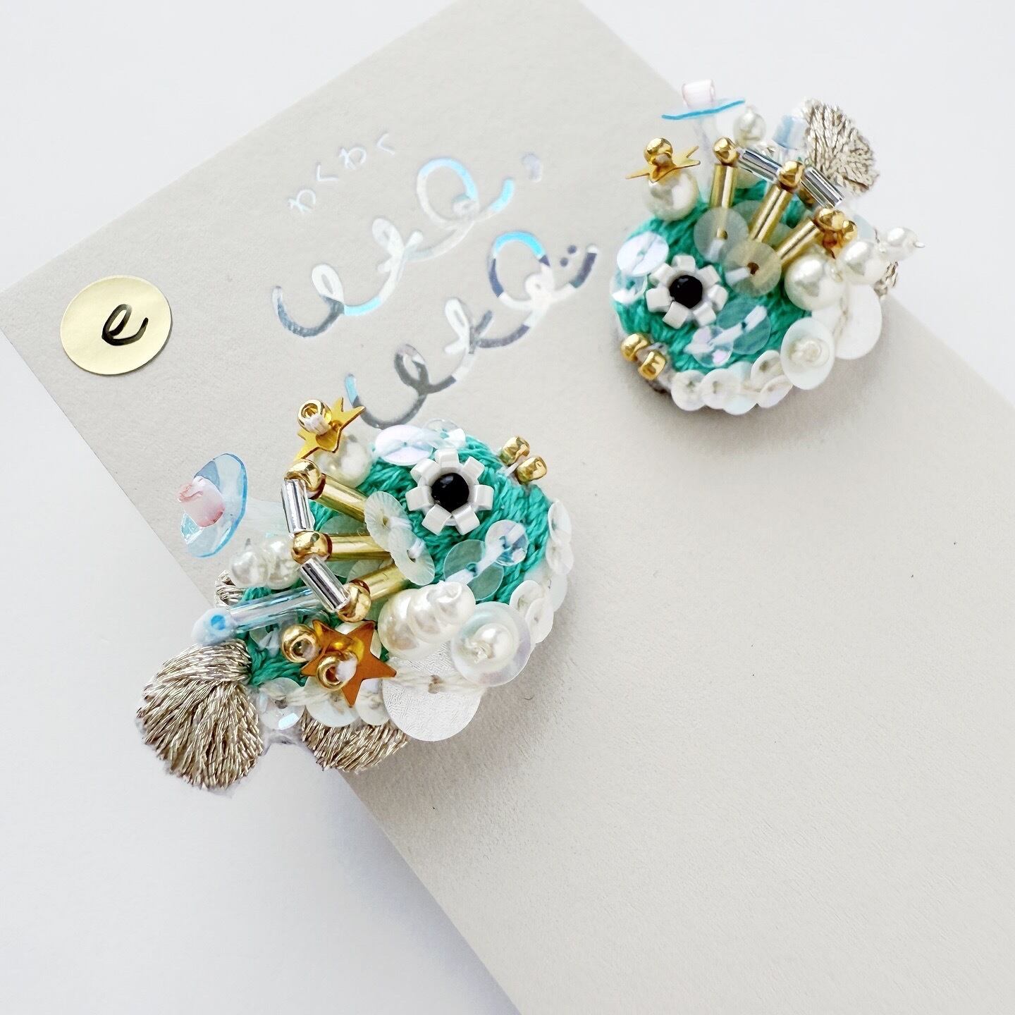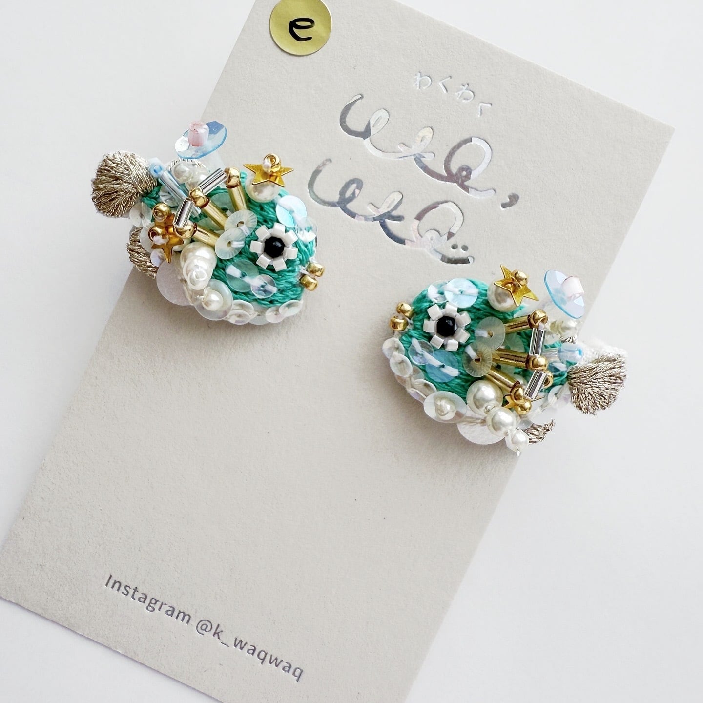 まん丸な目、キラキラのヒレ、スパンコールやビーズで表現したトゲ