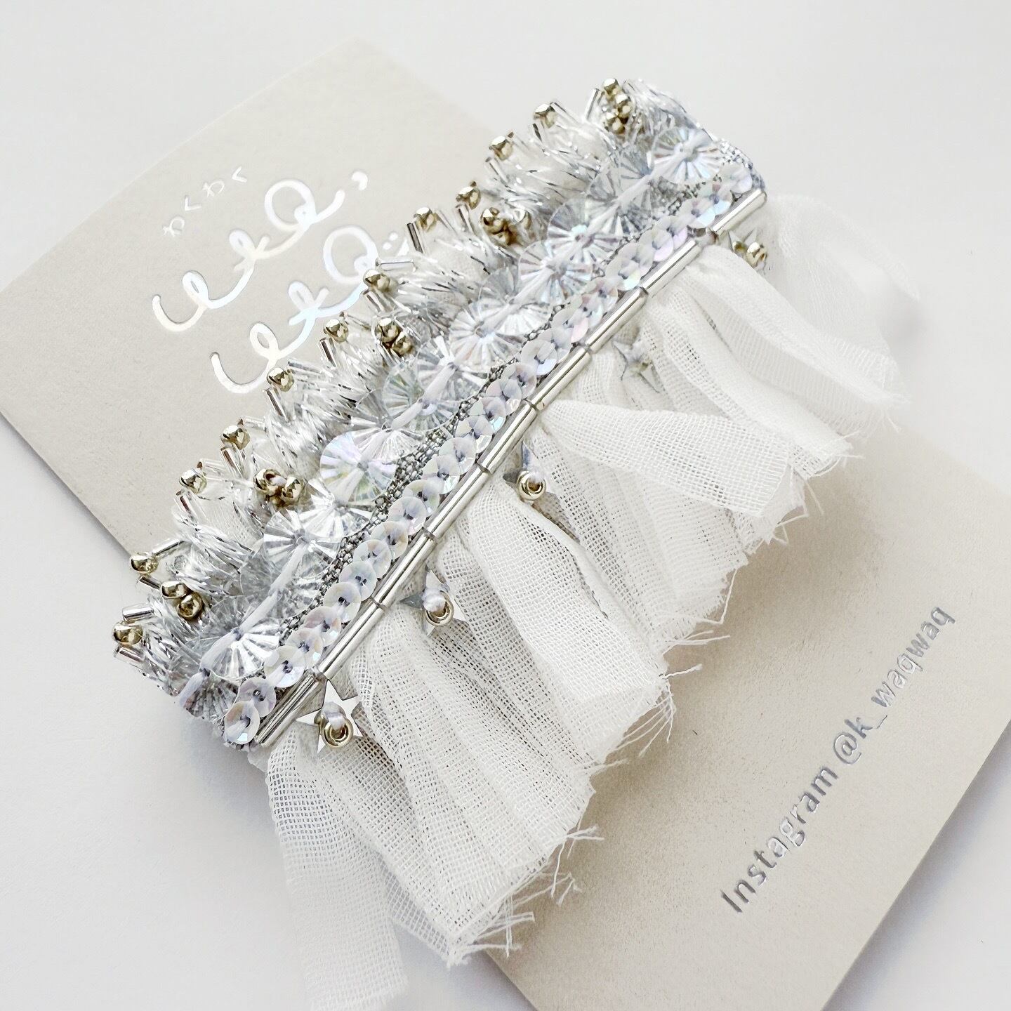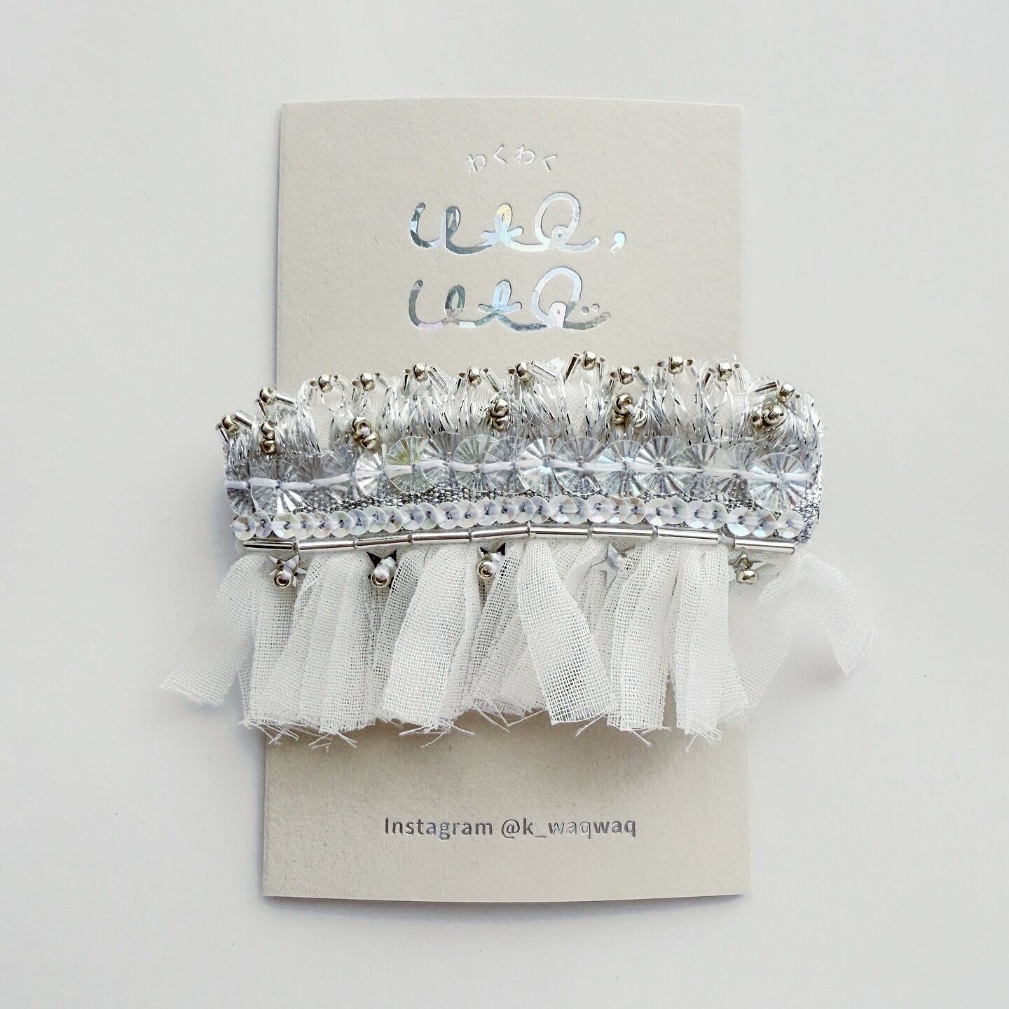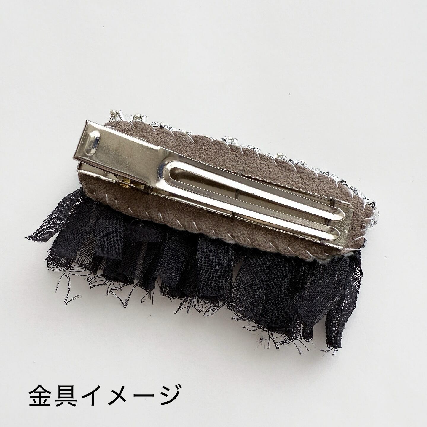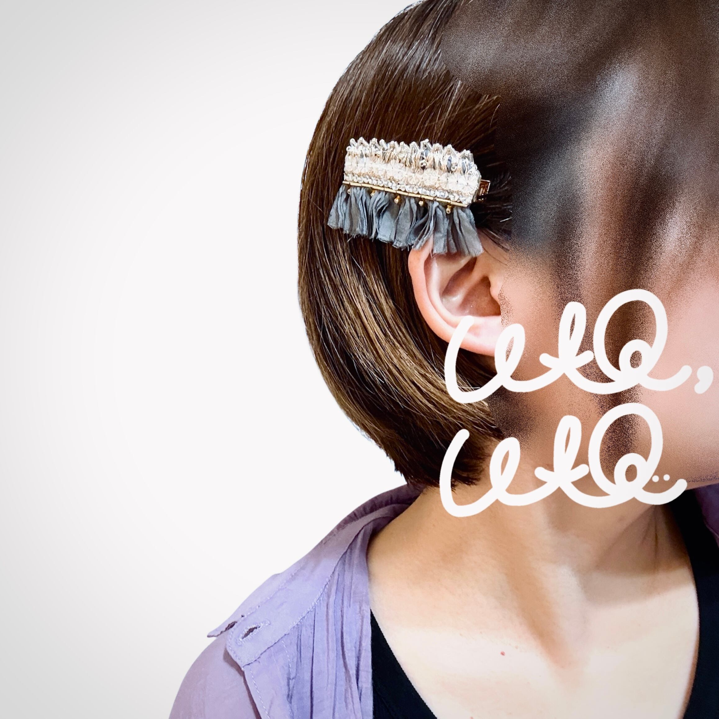 2種類のフリンジを重ねた上にスパンコールやビーズを刺繍して出来たチラチラ・チカチカとした輝きのヘアクリップです