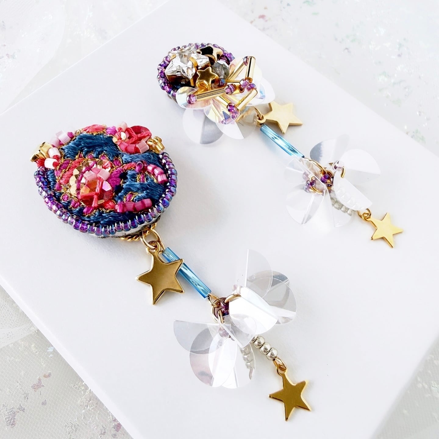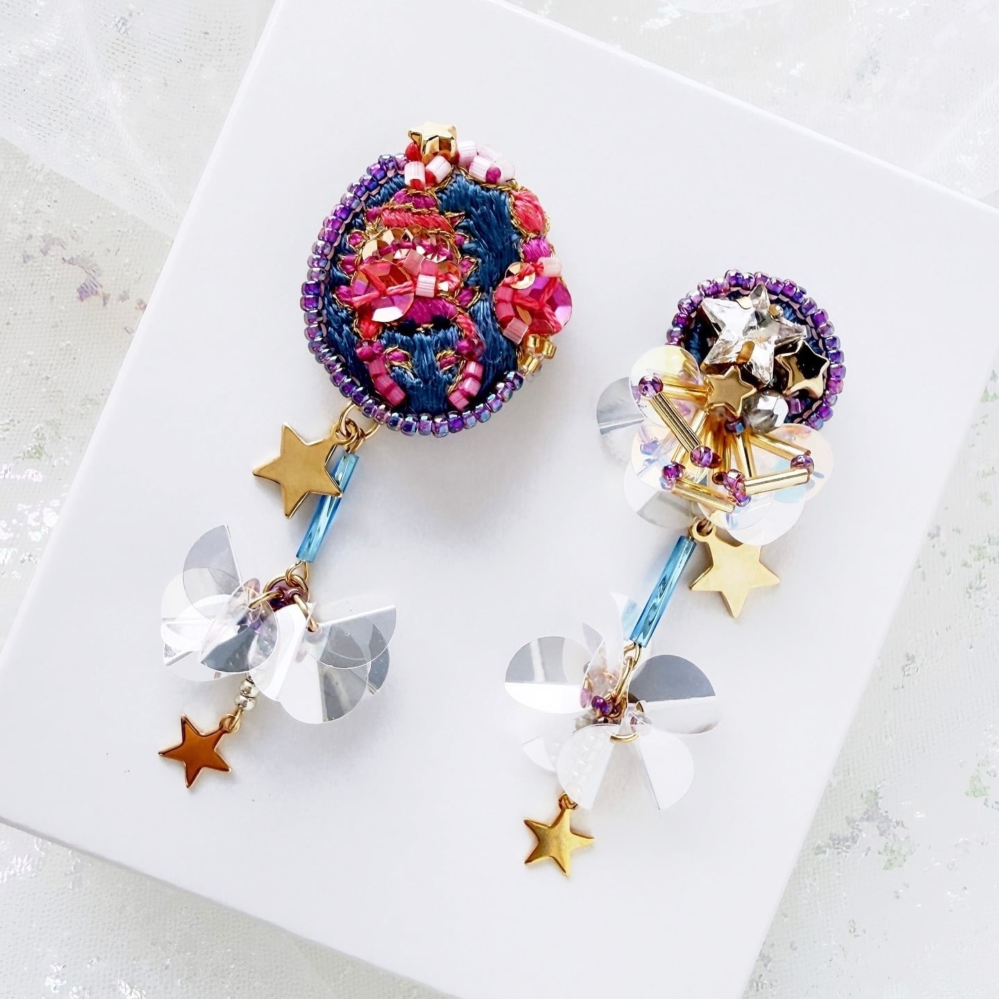 可愛く美しく手刺繍で繊細なデザインに仕上げた星座モチーフの耳飾り