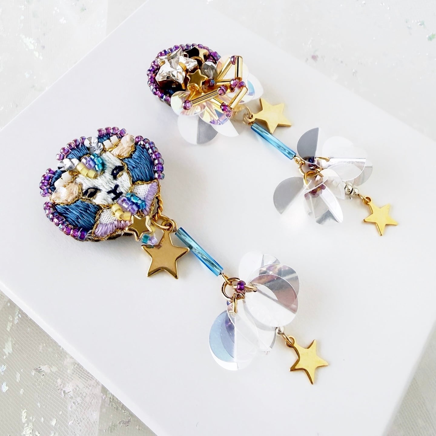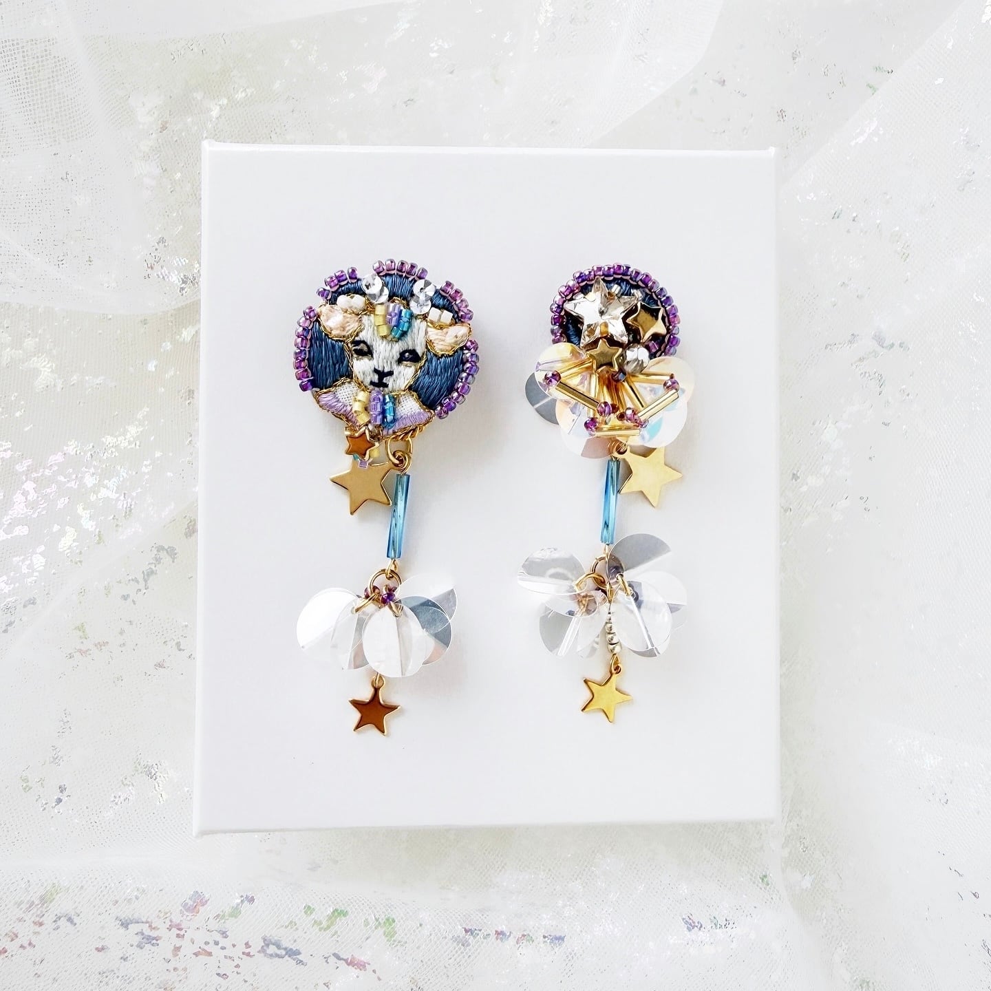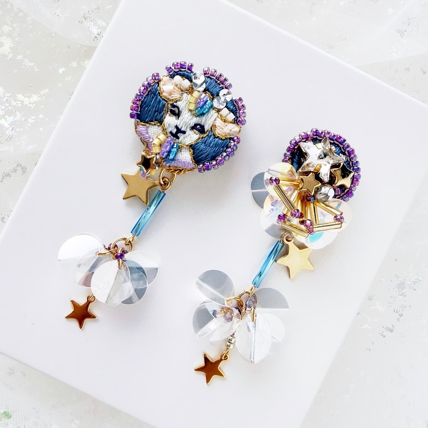 可愛く美しく手刺繍で繊細なデザインに仕上げた星座モチーフの耳飾り