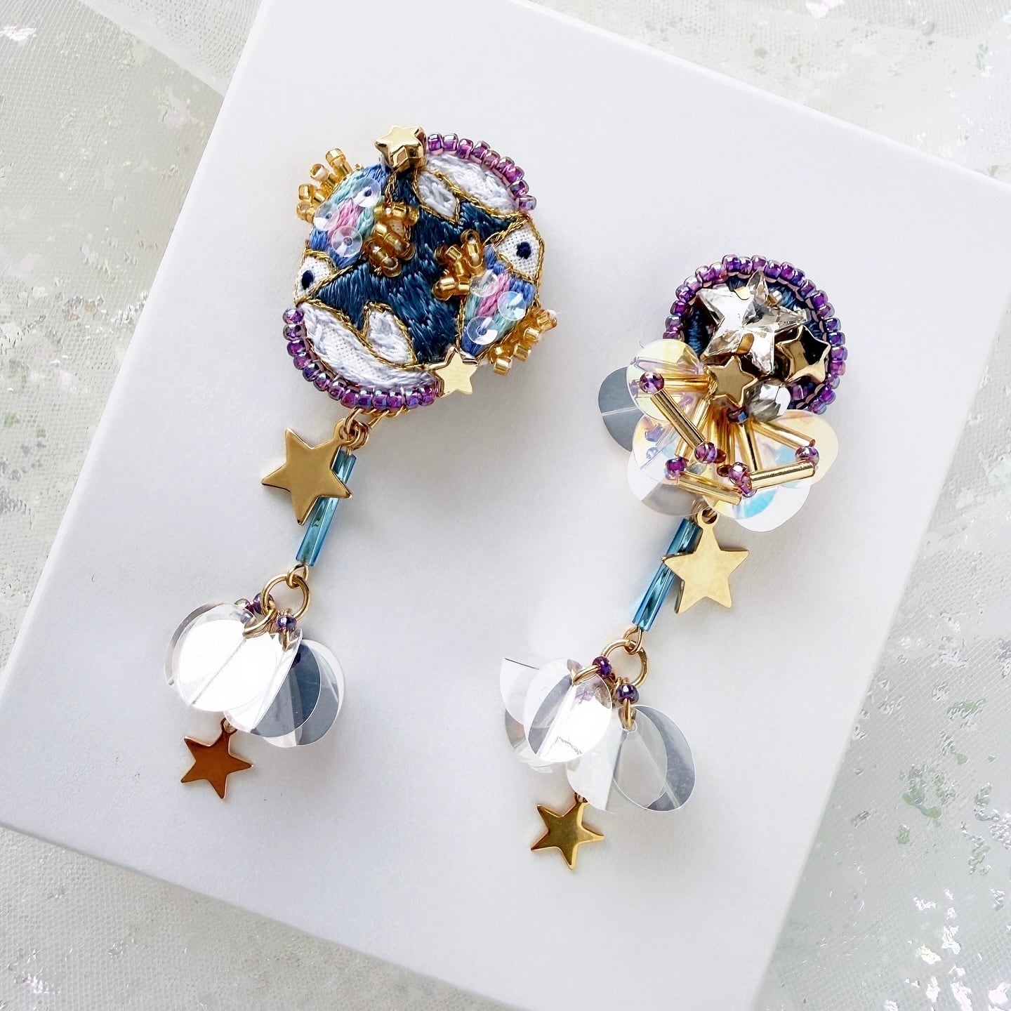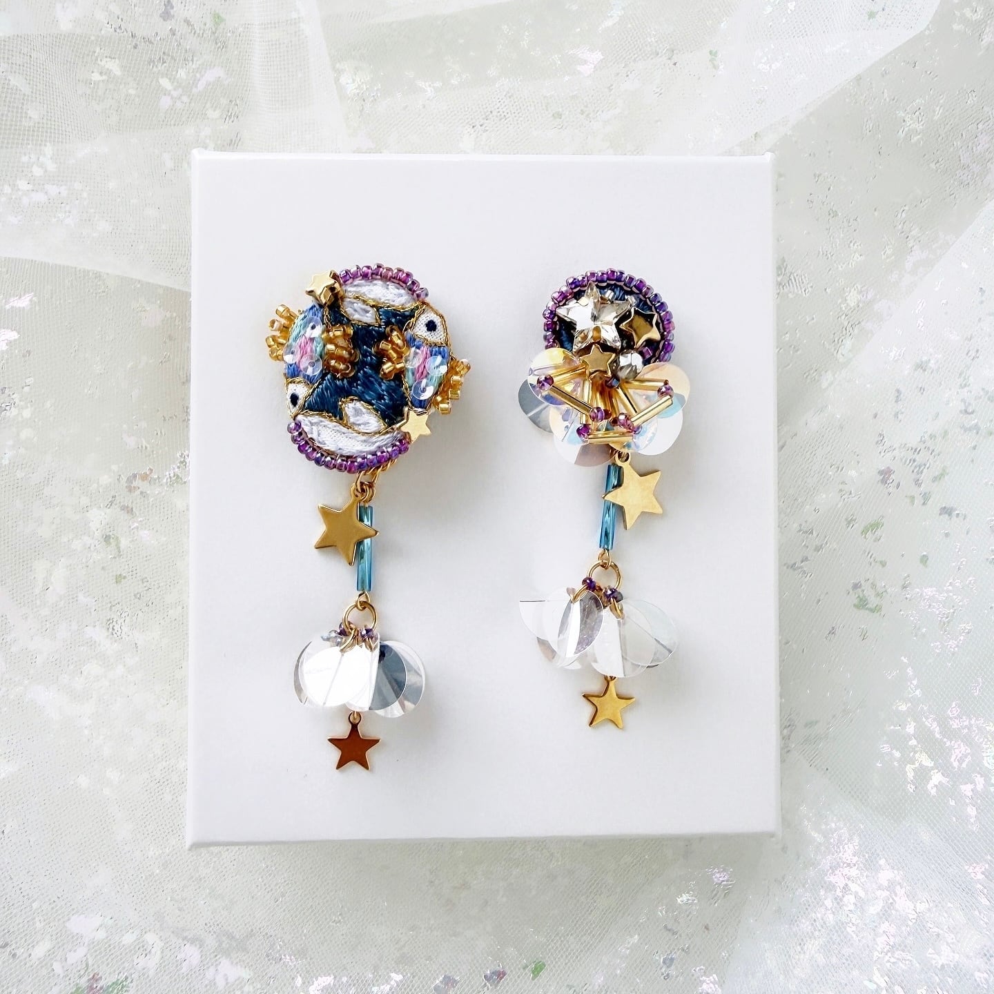 可愛く美しく手刺繍で繊細なデザインに仕上げた星座モチーフの耳飾り